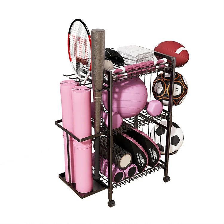 يحتوي رف تخزين بساط اليوجا المعدني القائم على الأرض على ثلاث طبقات بالإضافة إلى نظامي تخزين جانبيين. تم تصميم الجانب الأيسر بشكل مستقل، مما يوسع المساحة، والتي يمكن أن تحمل 2-3 سجادات يوجا بالحجم العادي عند وضعها في وضع مستقيم. يمكن أن يستوعب التخزين المستقيم أيضًا المعدات الطويلة مثل مضارب التنس، ومضارب البيسبول، وعصي الهوكي، وما إلى ذلك.